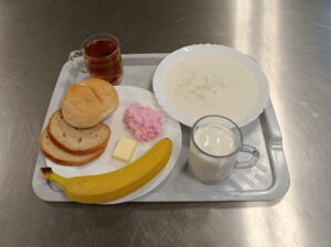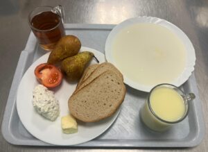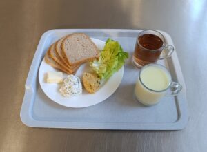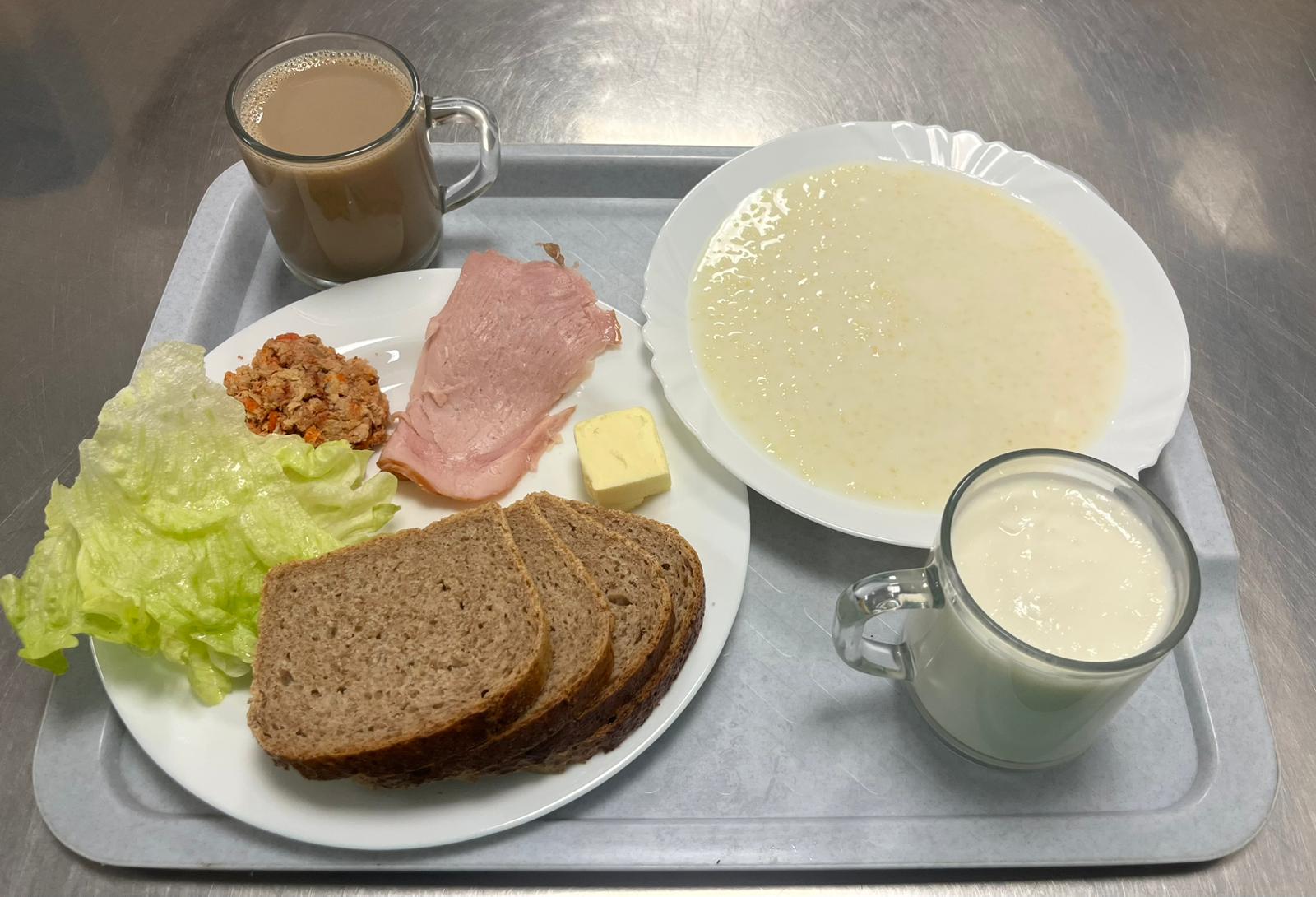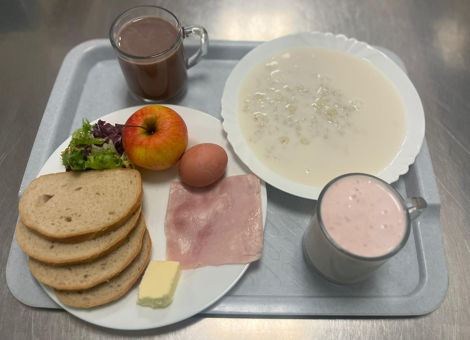 | OPIS POSIŁKU | DIETA PODSTAWOWA Zupa mleczna z zacierką pszenną 350 ml (MLE, GLU pszenny, JAJ), chleb pszenno-żytni 120g (GLU pszenny, GLU żytni) masło 82% tł. 20g (MLE), szynka konserwowa 60g (GLU pszenny, SEL, SOJ, GOR), ogórek zielony 60g, roszponka 10g, herbata czarna 300 ml II ŚNIADANIE: kisiel z jabłkiem 200 ml (MLE, GLU pszenny, JAJ) |