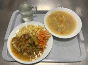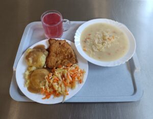 DIETA PODSTAWOWA Zupa neapolitańska z makaronem pszennym zabielana śmietaną 18% (bulion drobiowy, włoszczyzna, śmietana, natka pietruszki) 350 ml (MLE, GLU pszenny, JAJ, SEL, SOJ, GOR), wątróbka drobiowa duszona w sosie 200g (GLU pszenny, SEL), ziemniaki gotowane 200g, surówka szwedzka (ogórki kiszone, marchew, cebula, papryka, kukurydza, olej rzepakowy) 150g, kompot wieloowocowy bez cukru 300ml PODWIECZOREK: Maślanka 200 ml (MLE) |