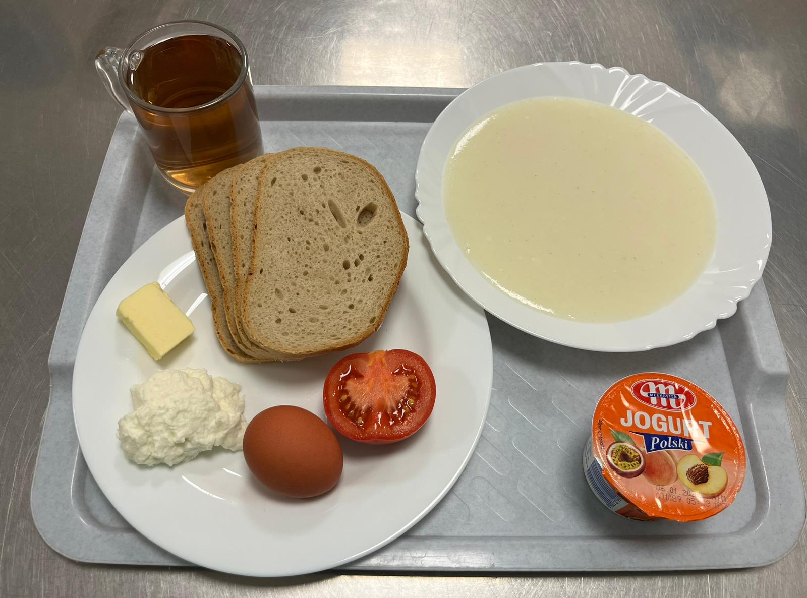 DIETA ŁATWOSTRAWNA Zupa mleczna z kaszą manną 350ml (MLE, GLU pszenny, ORZ migdały, ORZ włoskie, SOJ, GOR, ZIA, ŁUB), chleb pszenno-żytni 100g (GLU pszenny, GLU żytni), masło 82% 15g (MLE), serek waniliowy 50g (MLE), jajo gotowane (nie mniejsze niż 50g) 1szt (JAJ), pomidor 60g , herbata czarna bez cukru 300ml II ŚNIADANIE |