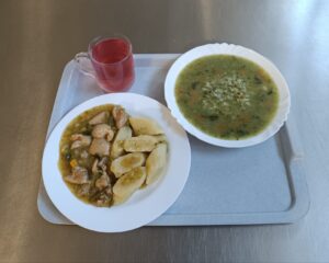 DIETA ŁATWOSTRAWNA Zupa szczawiowa z zacierką pszenną zabielana śmietaną 18% 350ml (MLE, GLU pszenny, JAJ, SEL, GOR), gulasz z żołądków drobiowych duszony 200g (GLU pszenny), ziemniaki gotowane z koperkiem 200g , bukiet jarzyn parowanych (marchew, brokuł, kalafior, warzywa sezonowe) 150g , kompot wieloowocowy bez cukru 300ml |