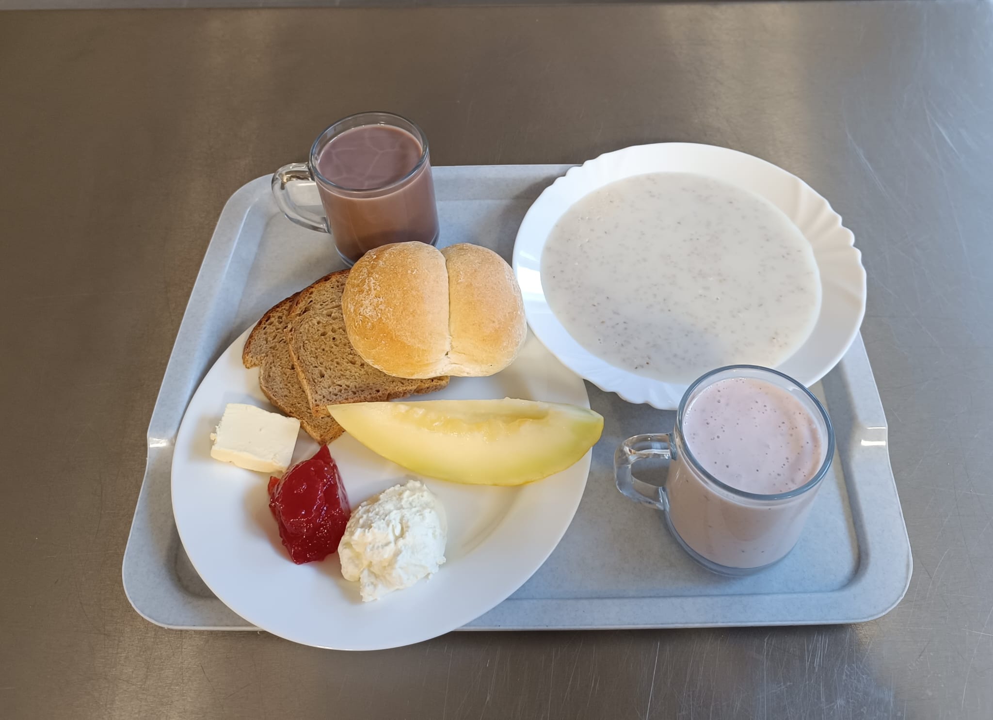DIETA ŁATWOSTRAWNA Zupa mleczna z kaszą jęczmienną 350ml (MLE, GLU jęczmie, ORZ migdały, ORZ włoskie, SOJ, GOR, ZIA), bułka pszenna 50g (GLU pszenny), chleb żytni razowy 40g (GLU żytni), masło 82% 15g (MLE), dżem owocowy niskosłodzony 50g, twaróg 50g (MLE), melon 150g, kakao bez cukru 300ml (MLE) II ŚNIADANIE |