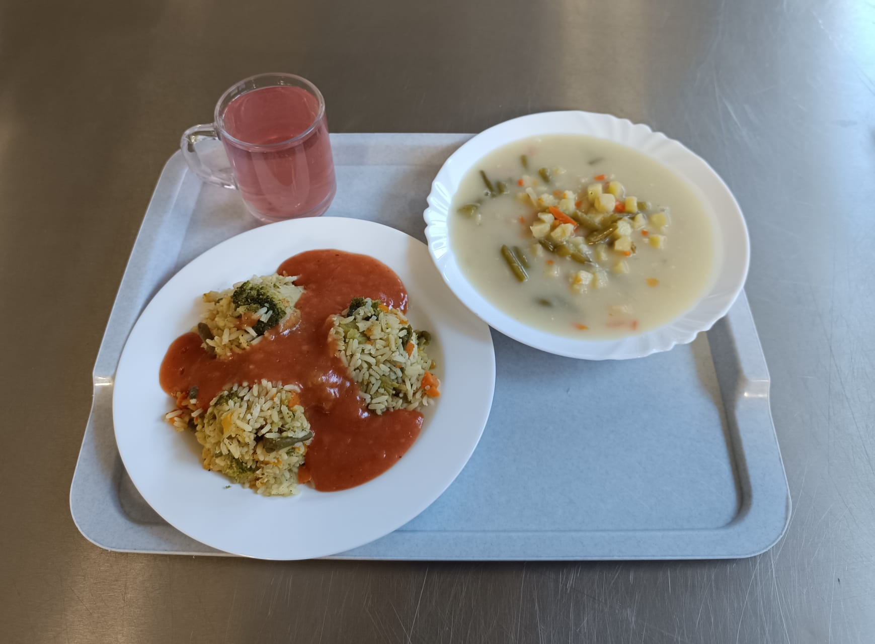 DIETA ŁATWOSTRAWNA Zupa ziemniaczana z fasolką szparagową i natką pietruszki 350ml (SEL), risotto z warzywami parowanymi (ryż paraboliczny, włoszczyzna, brokuł, cukinia, dynia, fasolka szparagowa) 350g (GLU pszenny, GLU jęczmie, SEL, GLU żytni, GLU owies, GLU orkisz), sos pomidorowy (woda, mąka pszenna, pulpa pomidorowa, koncentrat pomidorowy, śmietana 18%) 100ml (MLE, GLU pszenny), woda z cytryną 300ml