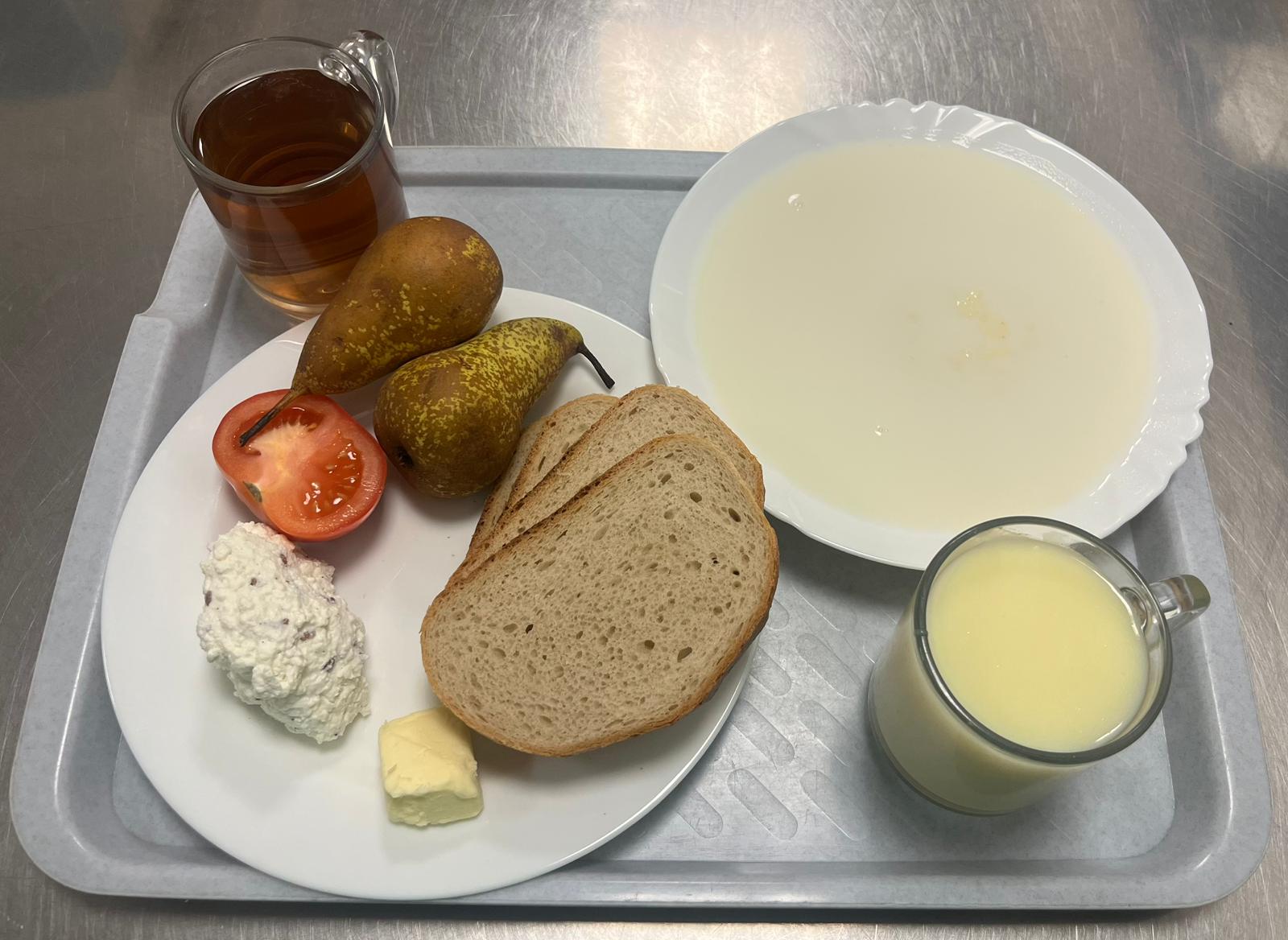 DIETA PODSTAWOWA Zupa mleczna z kaszą jaglaną 350ml (MLE, ORZ migdały, ORZ włoskie, SOJ, GOR, ZIA), chleb pszenno-żytni 100g (GLU pszenny, GLU żytni), masło 82% 15g (MLE), twarożek z rzodkiewką i siemieniem lnianym (wyrób własny) 80g (MLE, GLU pszenny, ORZ migdały, ORZ włoskie, ZIA), gruszka 150g , pomidor 50g , herbata czarna bez cukru 300ml II ŚNIADANIE |