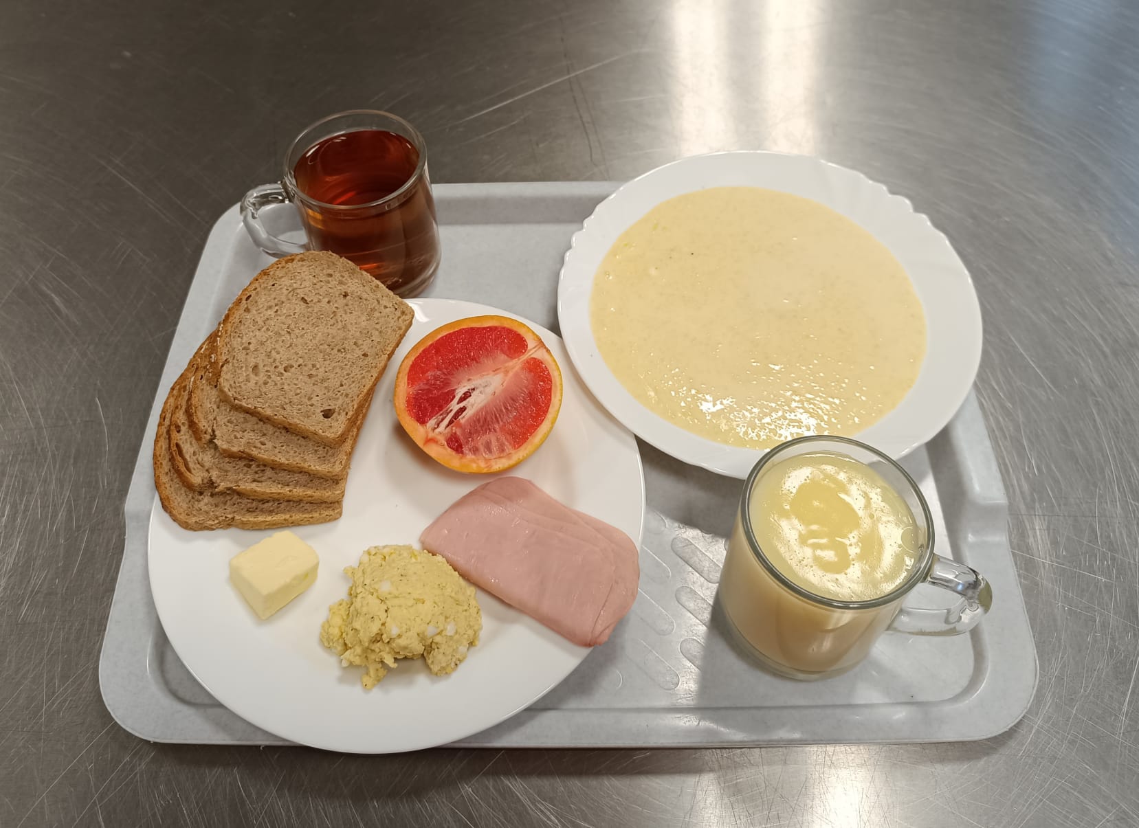 DIETA PODSTAWOWA Zupa mleczna z kaszą jaglaną 350ml (MLE, ORZ migdały, ORZ włoskie, SOJ, GOR, ZIA), chleb żytni razowy 100g (GLU żytni), masło 82% 15g (MLE), pasta jajeczna (wyrób własny) 50g (MLE, JAJ, GOR), szynka z indyka 30g (MLE, GOR), grejpfrut 150g, herbata czarna bez cukru 300ml II ŚNIADANIE |