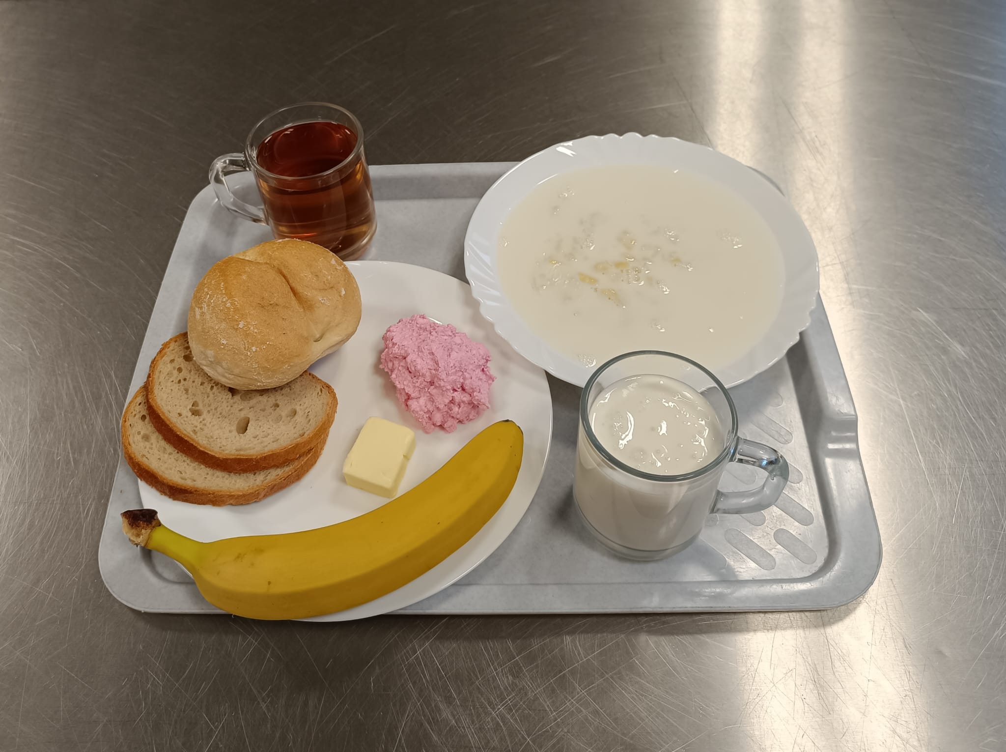 DIETA PODSTAWOWA Zupa mleczna z zacierką pszenną 350ml (MLE, GLU pszenny, JAJ), bułka pszenna 50g (GLU pszenny), chleb pszenno-żytni 40g (GLU pszenny, GLU żytni), masło 82% 15g (MLE), twarożek z burakiem i pietruszką (wyrób własny) 80g (MLE), banan 150g , herbata czarna bez cukru 300ml II ŚNIADANIE |